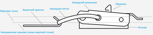Даний кріпильний елемент (інші назви продукції: затискні замки-засувки, затискачі, клямка "жаба", фіксатор, засувка-затиск, замки важільні, затвори важільні, засувка для тари) - використовується в якості фіксуючих елементів. Засувки широко застосовуються у виготовленні ящиків, хомутів, фильтрбоксов, корпуси технологічного та ін. обладнання, в меблевому виробництві, а також при відповідальних ізоляційних роботах для виготовлення швидкознімних кожухів, обичайок. Наявність петлі і отвори під пломбу розширює сферу застосування затиску - засувки в тих областях, де потрібна опломбування вмісту. Засувку можна закріпити різними способами: засувку приварюють, скріплюють затискач саморізами або, найчастіше, з'єднують заклепочних інструментом, встановивши їх на заклепку.